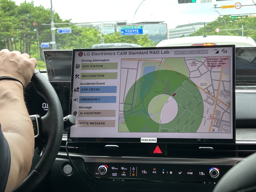 서울 강서구에서 진행된 LG전자의 인공위성 기반 차량 내 음성통신 솔루션 시연에서 차량이 지상망 연결 지역에서 비지상망 지역으로 진입하고 있다. 박승주 기자
