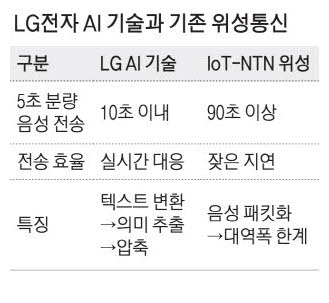 LG전자가 선보인 이 기술은 정지궤도 위성을 활용한 비지상 통신망(IoT-NTN)을 기반으로 업그레이드 됐다. 기존 롱텀에볼루션(LTE)·5세대(5G) 등 지상망(TN) 연결이 불가능한 지역에서도 차량 내 음성통신을 가능하게 해주는 차세대 솔루션이다. 한국은 지상망이 전국 대부분을 커버하지만 산불 등으로 통신 인프라가 유실된 재난 현장에서는 무용지물이 될 수 있다. 재난 상황에서 위성 기반 통신은 구조센터와 실시간 대화를 가능하다. 고궤도 IoT-NTN 통신은 좁은 대역폭 및 전송지연 시간이 큰 한계로 꼽힌다. 고궤도 IoT-NTN 위성을 활용할 경우 물리적인 거리와 좁은 대역폭 때문에 5초 분량 음성 메시지를 보내는 데만도 1분 30초 이상이 걸리는 것이 일반적이다. LG전자는 이 문제를 해결하기 위해 인공지능(AI) 기반 음성 메시지 경량화 기술을 개발했다. 음성을 텍스트로 변환한 뒤 주요 의미만 추출해 1개의 패킷에 담는 기술이다. 동일한 메시지를 약 10초 만에 전송할 수 있다.
