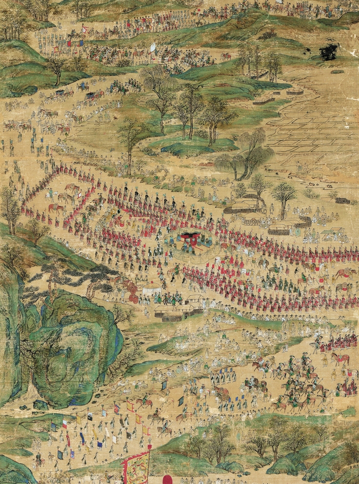 화성능행도 병풍 중 환어행렬도(일부). 정조가 어머니 혜경궁 홍 씨와 아버지 무덤인 현륭원(융릉)을 찾았던 화성능행의 위용과 규모를 짐작케 한다. <국립고궁박물관 소장> 조선 22대 정조(1752~1800·재위 1776~1800)는 재위기간 일관되게 아버지 사도세자 추존사업과 강력한 정치개혁을 통해 비대해진 신권을 억눌러 왕권을 강화하고자 노력했던 왕이다. 따라서 정조하면 효심과 개혁의 이미지가 먼저 떠올려진다.