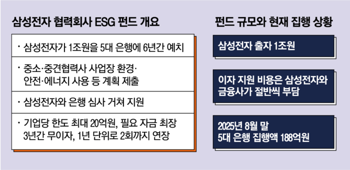 이 펀드를 통한 지원은 중소·중견기업에는 상당히 파격적인 수준이다. 삼성전자 혹은 삼성디스플레이가 협력회사들에 대한 검토를 거쳐 주거래를 하는 은행에 우수 협력회사들을 추천하면,은행은 해당 기업이 ESG 관련 규정을 충족시켰는지를 심사한다. 심사를 통과하면 이 기업은 최대 20억원 한도에서 최초 대출 이후 1년 단위로 최대 2회까지 연장해 최장 3년간 무이자로 대출을 받을 수 있다.