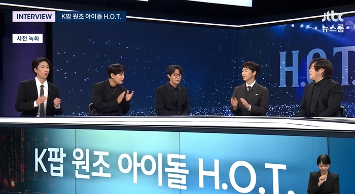 H.O.T.가 ‘뉴스룸’에 출연해 이야기를 나눴다. 사진| JTBC 최근 넷플릭스 애니메이션 ‘케이팝 데몬 헌터스’(이하 ‘케데헌’)의 사자보이즈가 H.O.T.의 영향을 받았다는 사실도 전해졌다. 매기 강 감독은 과거 H.O.T.의 팬이었다며 캐릭터 콘셉트에 영향을 받았다고 밝혔다.