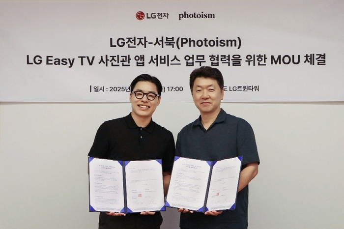 < 서북 김민석 대표,LG전자 백선필 상무 / 출처 : 서북(Photoism) > 셀프 포토 브랜드 포토이즘(Photoism)을 운영하는 서북은 LG전자와 함께 시니어 맞춤형 신제품 ‘LG 이지 TV(LG Easy TV)’에서 구동될 ‘사진관 앱’ 서비스 연동을 위한 업무 협약(MOU)을 체결했다고 밝혔다.