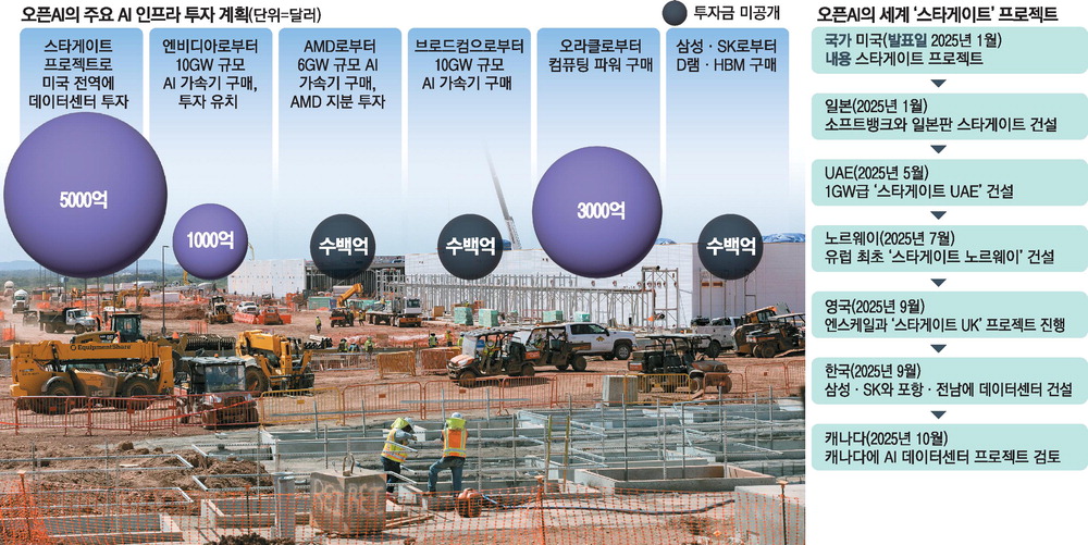 오픈AI는 올해 초부터 오라클,일본 소프트뱅크와 함께 미국에서 4년간 5000억달러를 투입하는 초대형 AI 인프라 구축 사업 '스타게이트' 프로젝트를 진행하고 있다. 올트먼 CEO는 스타게이트 프로젝트를 미국을 넘어 전 세계로 확대했다. 지난해부터 각국 정상과 대표 기업들을 만나면서 '소버린 AI'를 강조했다. 자국 AI 데이터센터를 구축하려는 현지 기업·정부와 손잡은 것이다. 오픈AI가 직접 돈을 쓰지 않아도 파트너와 정부의 자금으로 전 세계에 AI 인프라를 구축하는 모습이다.