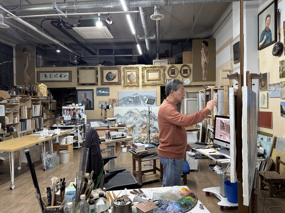 지난달 말 찾은 경기도 고양시 삼송테크노밸리. '웅~' 하는 기계음과 지게차 소리가 공장 지대 풍경을 연상케 했다. 차량이 길게 서 있는 옆문을 열자 딴 세상이 펼쳐졌다. 사방 벽에는 누드화와 초상화가 걸려 있고,자작나무 겨울 풍경이 이젤 위에서 채색을 기다리고 있었다. 초상화가 이원희(69)의 화실이다. 7m가 넘는 높은 층고에서 뿜어져 나오는 개방감이 압도적이었다.