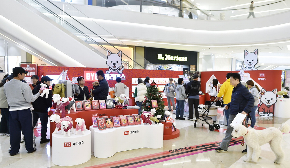 BYC가 이번 가을·겨울 시즌 신제품을 소개하기 위한 개리야스 팝업스토어를 스타필드 하남에서 열었다. 사진은 지난 9일 스타필드 하남의 개리야스 팝업스토어를 방문한 고객들과 강아지 모습. BYC