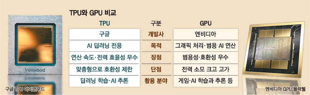 가격 경쟁력은 물론 성능 면에서도 그래픽처리장치(GPU)를 위협하는 구글의 텐서처리장치(TPU)가 전면에 부상하며 인공지능(AI) 반도체 시장에 지각 변동이 일어나고 있다. GPU 절대 강자인 엔비디아의 독주 체제에 균열이 생기면서 국내 메모리·AI 업계에도 새로운 기회가 열릴 것이라는 기대가 나온다.