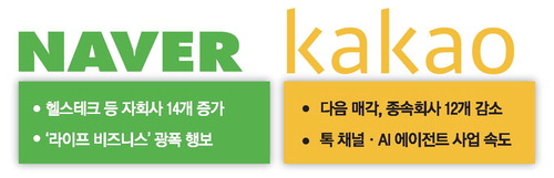 국내 빅테크 양대 산맥인 네이버와 카카오가 '인공지능(AI)의 일상화' 시대를 앞두고 완전히 상반된 생존법을 택했다. 네이버는 일상의 모든 접점을 아우르는 '초연결 확장'에 광폭 행보를 보이고 있고,카카오는 그룹 전반에 걸쳐 고강도 '군살 빼기'를 이어가고 있다.