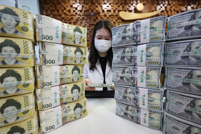 사진은 이날 서울 중구 하나은행 위변조대응센터에서 직원이 달러화를 정리하고 있는 모습. 2026.4.3 (연합) 지난해 한국의 수출 대금 결제액 중 원화 결제 비중이 역대 최고 수준을 기록한 것으로 나타났다. 미국 달러와 엔화 등 원화를 제외한 다른 통화의 비중은 모두 감소했다.