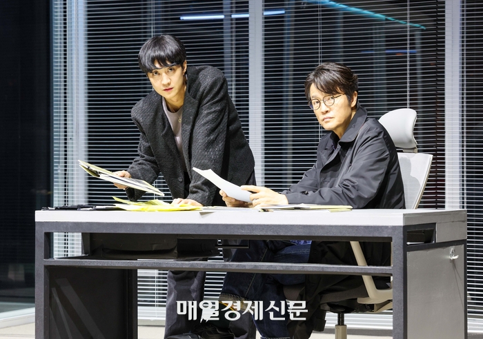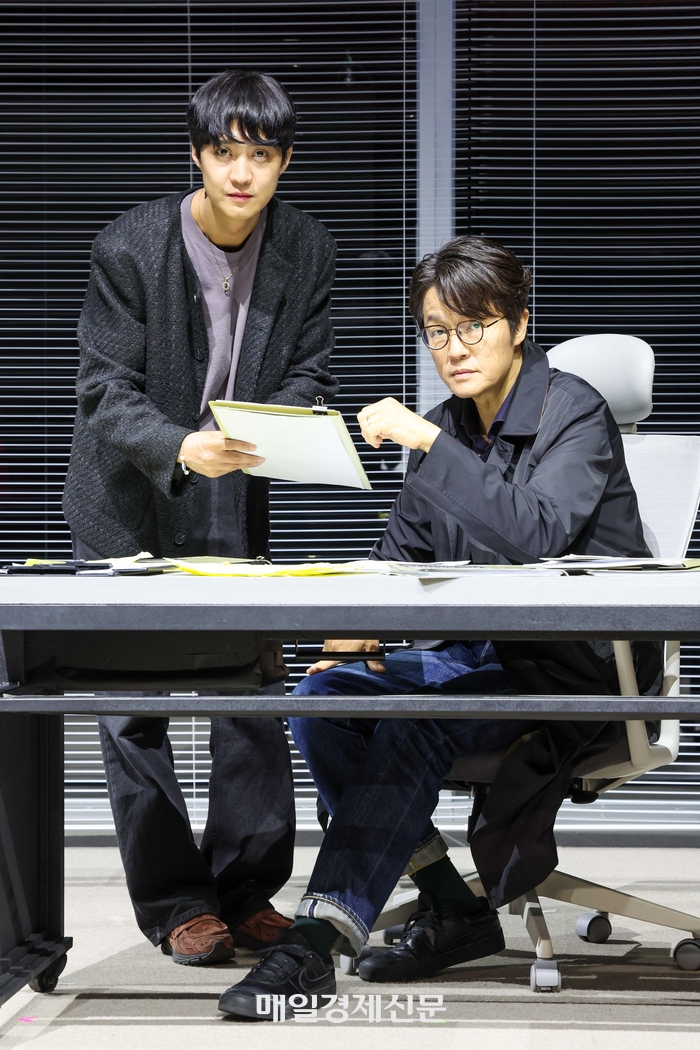 연극 ‘빅마더’ 조연 배우 조한철(오른쪽) 김세환. 2026.4.20 [한주형기자] 실제 언론인 아버지를 둔 김세환에게 이번 작품은 각별했다. 중앙일보 편집국장을 지낸 그의 아버지는 공연을 보고 “편집국장이 회사 수익을 신경 쓰면서 후배들도 챙겨야 하는 고충이 가장 공감됐다”는 말을 전해왔다고 한다. 김세환은 “아빠의 어깨 뒷모습,책상에 앉아 뭔가를 계속 쓰시는 모습들이 이미지적으로 도움이 됐다”며 “진정성 있는 한 문장이 있는 기사를 좋아했는데 요즘엔 그런 글을 찾기가 어렵다고 하셨던 말도 캐릭터를 이해하는 데 닿았다”고 말했다.