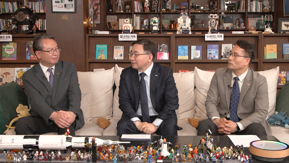 권이균 한국지질자원연구원장,이식 한국과학기술정보연구원장,오영국 한국핵융합에너지연구원장(왼쪽부터)이 대전의 한 카페에서 대담 프로그램을 촬영하고 있다.