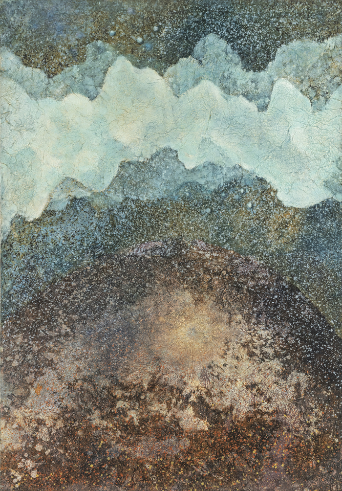 방혜자의 ‘하늘의 땅’(2011) <국립현대미술관 이건희컬렉션> 빛을 표현한 원형 작업이 특히 눈길을 끈다. 작가는 닥종이를 고깔 모양으로 구겨 주름을 만들고 이를 펼쳐 먹으로 원형을 그렸다. 이후 종이의 결을 따라 붓질했다. 튀어나온 부분에 색이 입혀지고 패인 부분에는 여백이 남는다. 여기에 아크릴,천연안료,유화 등을 여러 겹 쌓아 올렸다. 뒷면에 색을 입혀 앞면에 은은하게 스미게 하는 동양화의 배체법을 더해 독특한 마티에르를 완성했다. 빛이 반짝이듯 아름다운 색채가 깊이 있는 화면에서 피어오른다.