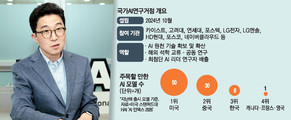 김 센터장이 진두지휘하는 국가AI연구거점은 글로벌 기술 패권 경쟁 속에서 한국의 기술 주권을 지켜낼 '방어선' 역할을 한다. 2024년 10월 개소 이후 공개 소프트웨어 113건,학술대회 발표 171건,특허 40건의 성과를 냈다. 특히 세계 최고 권위를 가진 AI 학술대회 '뉴립스(NeurIPS)'에서만 39편의 논문이 채택됐고,그중 상위 1% 에 해당하는 '스포트라이트' 논문도 4건이 선정될 정도로 성과가 두드러진다.